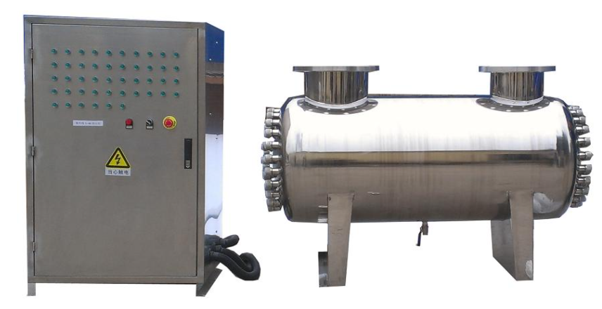 1.過流式紫外線殺菌器是臥式結構設備,主要由殺菌器、控制箱及電氣等部分組成。