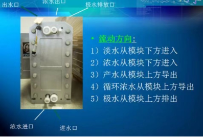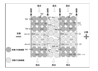 EDI裝置是一種新型的除鹽設備,是以離子交換技術與電滲析技術相結合。離子交換樹脂不斷進行離子置換,當樹脂內部氫氧分子被置換完之后,高壓電場的作用下,水分子被不斷分解成H+和OH-,在混床離子交換樹脂中局部H+和OH-的產生使樹脂和膜不需要添加化學藥品就可以持續再生,并持續進行離子交換,循環往復。
