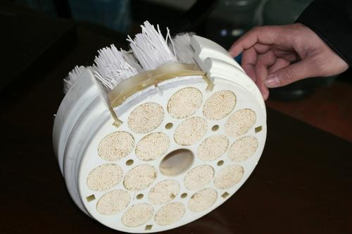 將壓力容器內的超濾膜抽出,浸在水容器中,一端進水管用專用工具封堵,另一端用專用進氣工具在進水管進氣,進氣壓力控制在<0.1mpa,該膜在小于0.1mpa時膜絲只透過水不透氣,如果出現透氣現象,則證明膜絲有斷絲現象,記錄膜絲斷絲位置,然后用膜針配合專用膠,封堵在膜絲斷絲點上。