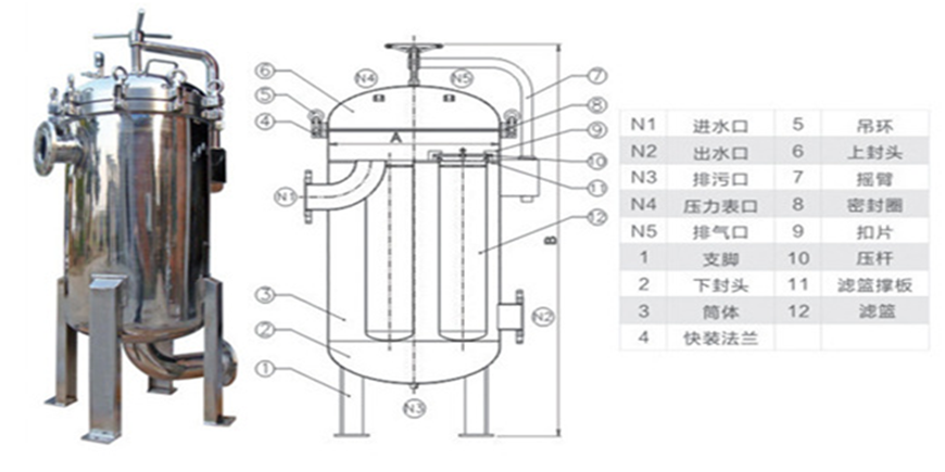 保安過濾器主要由過濾外殼,過濾濾芯等組成,過濾外殼大部分由R304不銹鋼材料組成,如用在耐酸堿等特殊場合則可采用R316不銹鋼做外殼。可分為法蘭式與卡箍式,而法蘭式外殼主要用在過濾流量較大的場合。過濾濾殼中間裝的過濾濾芯主要以PP過濾棉芯為主,有些場合也可選用線繞濾芯或活性炭濾芯。濾芯的安裝數目可從一支到幾十支不等,主要是根據處理量的大小來確定。