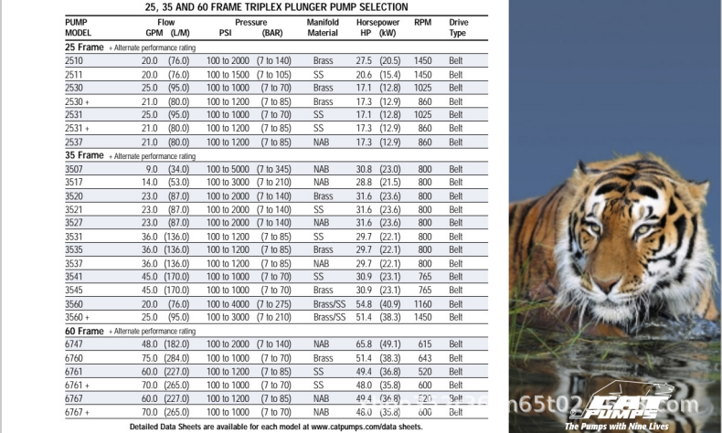 CAT PUMP高性能不銹鋼全系列各個型號的液壓泵,其主要應用于海水淡化、石油和天然氣、發電、選礦、公共交通車和重型設備清洗、廢水壓住、液力挖掘、激光切割塑料塑料馬口鐵等領域和市場。CAT PUMP以高能效、低維護、持久耐用等特性贏得了海內外客戶的一致好評。它以高質量的材料、嚴格的制造精度、獨特的密封材料和設計以及同心密實的陶瓷活塞為您提供一年又一年的持續運轉,每臺泵都可以選配以下系統附件,如:調壓閥、卸壓閥、二級安全閥、脈動抑制器(蓄能器)、壓力表、過濾器、柔性進料和出料管等。 CAT PUMPS應用領域與市場:海水淡化 反滲透系統、消毒 車輛清洗、汽車沖洗 廢水壓注、濕法清理 液力挖掘、掘進 管路、容器的液壓測試 重型設備的清洗 公共交通車輛的清洗 木材的調濕處理 氣味控制、噴霧冷卻 激光切割塑料、紙板、馬口鐵 液體傳送、計量、化學處理 石油、天然氣處理、表面預處理農業噴灑肥料、除草劑等 CO2和其它易蒸發液體 下水道和管道的清理等多個領域 貓牌泵的常用型號: 1010 1050ALT 1520 152R08