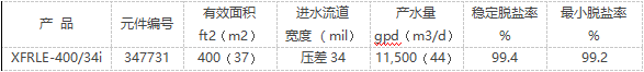 2. 為對比目的,按某些廠家使用的1,500 ppm NaCl溶液進行標準化測試,XFRLE-400/34i的產水量為12,300gpd(16.6m3/d),穩定脫鹽率為99.4%。