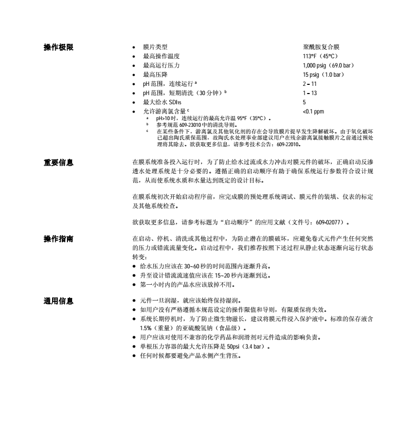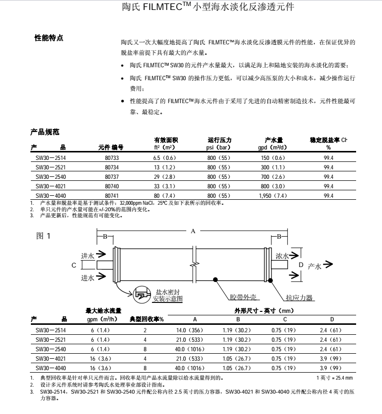 陶氏反滲透膜SW30-2540適合于高濃度海水的淡化處理,適用于高回收率系統的海水淡化和苦咸水淡化,來制造發電廠鍋爐補給水等各種工業用水和生活用水,也應用于廢水再利用,如食品、電鍍金屬等有價物質的濃縮回收在內的多種領域。