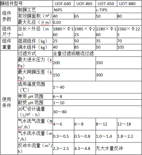 1、高抗污染的聚偏氟乙烯(PVDF)膜材料,膜通量高,出水穩定,使用壽命長;