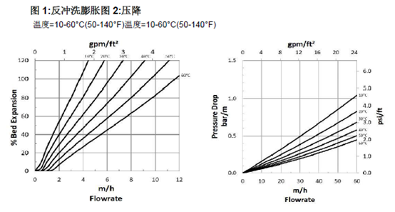 圖1顯示了杜邦Amberlite HPR9500離子交換樹脂床層膨脹與反沖洗流量和溫度的關系。