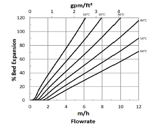 下圖顯示了杜邦AmberLiteHPR9000 OH凝結水拋光樹脂的床層膨脹隨反洗流量和溫度的變化。