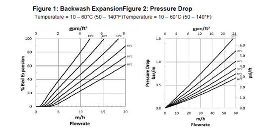 圖1顯示了杜邦A(yù)mberLite HPR8300 H離子交換樹脂混床層膨脹與反沖洗流量和溫度的關(guān)系。圖杜邦A(yù)mberLite HPR8300 H離子交換樹脂的估算壓降與服務(wù)流量和溫度的關(guān)系如圖2所示。這些壓降預(yù)期值在使用清潔水的服務(wù)運行開始時是有效的。
