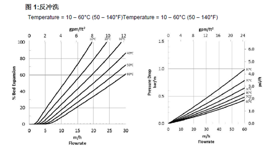 圖1顯示了杜邦Amberlite HPR8400H離子交換樹脂床層膨脹與反沖洗流量和溫度的關系。