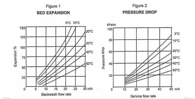 0 2呈現 AMBERLITE IR120Na以采水流量及水溫為函數壓力降特性。壓力降的 數據在已顆粒分層后的樹脂床,并以干凈水為入水的第一次采水周期方有效。