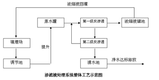 垃圾分解過程是一個非常復雜的生物、化學和物理過程,其一部分中間產物形成填埋氣排出垃圾場,另一部分被滲入的雨水沖刷、溶解,經過收集系統(tǒng)排出,產生了滲濾液,下圖即為DTRO技術處理垃圾滲濾液零排放的工藝示意圖。