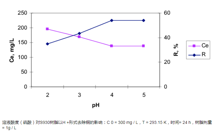 螯合離子交換樹脂Purolite S930的實驗條件對從水溶液中去除銅(II)離子的影響。通過分批實驗研究了溶液的pH值,初始金屬濃度,接觸時間,溫度,樹脂的離子形式和樹脂用量的影響。Cu(II)的去除百分比在pH 5.0(緩沖溶液)下最大,并且隨著樹脂劑量,接觸時間和溫度的增加而增加,并且隨著溶液的初始濃度增加而減少。
