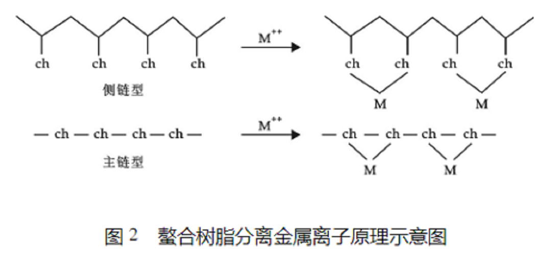 在圖2中,ch是一個官能團(tuán),它對某些金屬離子具有特定的絡(luò)合能力。因此,它可以將這些金屬離子從其他金屬離子中分離出來。由于其特殊的選擇性分離功能,集成樹脂具有很大的發(fā)展前景。已經(jīng)成功研究了30多種產(chǎn)品,但真正實(shí)現(xiàn)工業(yè)化的產(chǎn)品并不多。最常用的是以型號有:漂萊特螯合樹脂S930,升級版漂萊特S930 Plus