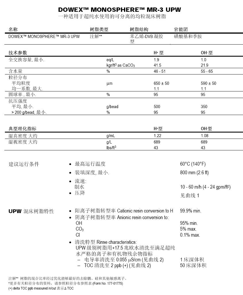 | DOWEX™ MONOSPHERE™ MR-3 UPW | 注解** | 苯乙烯-DVB 凝膠 型 | 磺酸基和季胺 |