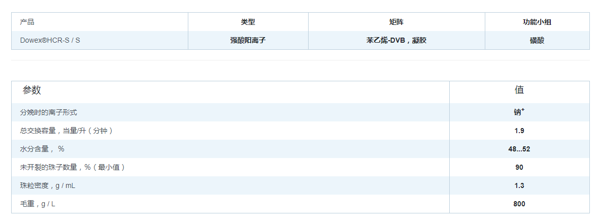 陶氏HCR-S/S軟化樹脂參數